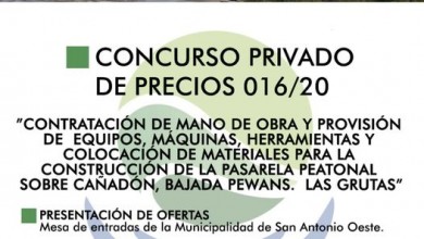 CONSTRUCCIÓN DE LA PASARELA PEATONAL SOBRE CAÑADÓN, BAJADA PEWANS DE LAS GRUTAS, CONCURSO PRIVADO DE PRECIOS N° 016/2020