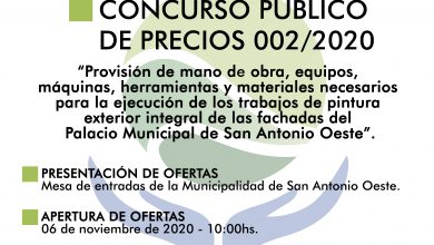 La Municipalidad de San Antonio Oeste llama a Concurso Público de Precios N°003|2020 que tiene por objeto el ofrecimiento en…