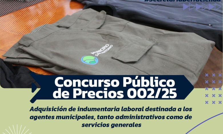 El Municipio San Antonio realiza el llamado a Concurso Público de Precios N°002/2025, que tiene por objeto la “adquisición de indumentaria laboral destinada a los agentes municipales, tanto administrativos como de servicios generales”.
