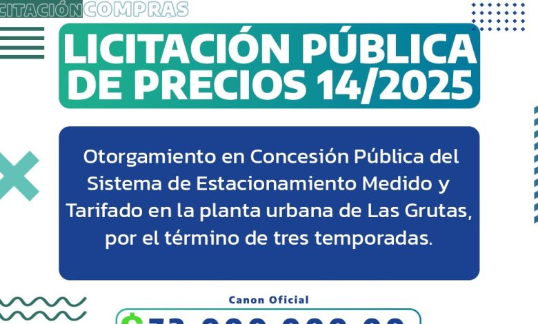 El Municipio San Antonio realiza el llamado a Licitación Pública N°014/2025, que tiene por objetivo el otorgamiento en concesión pública del Sistema de Estacionamiento Medido y Tarifado en la planta urbana de Las Grutas, por el término de tres (3) temporadas.