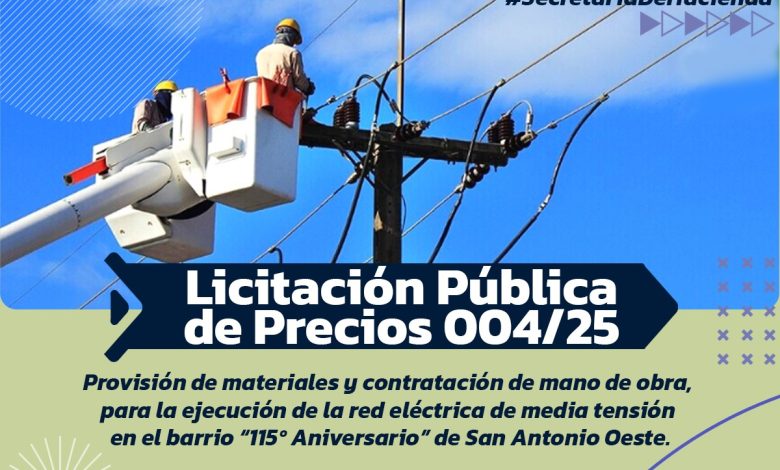 El Municipio San Antonio realiza el llamado a Licitación Pública N°004/2025, que tiene por objeto la “provisión de materiales y contratación de mano de obra, para la ejecución de la red eléctrica de media tensión en la urbanización denominada 115º Aniversario de la planta urbana de San Antonio Oeste”.