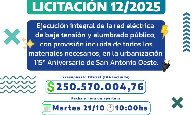 El Municipio San Antonio realiza el Llamado a Licitación Pública N°012/2025, que tiene por objeto la ejecución integral de la red eléctrica de baja tensión y alumbrado público, con provisión incluida de todos los materiales necesarios, en la Urbanización 115º Aniversario de la planta urbana de San Antonio Oeste.