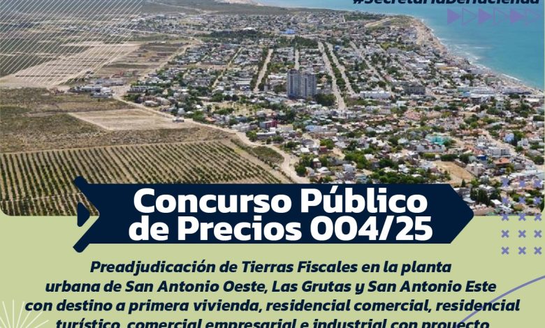 Se informa que habiéndose realizado la apertura de sobres del Concurso Público N°004/2025 que tenía como fin la preadjudicación de Tierras Fiscales en la planta urbana de San Antonio Oeste, Las Grutas y San Antonio Este, en el que resultó la presentación de dos (2) oferentes, el cual resulta conveniente a los intereses municipales las ofertas presentadas por el Sr. PIOPPI Lautaro Ismael y del Sr. MORALES Denis Javier.